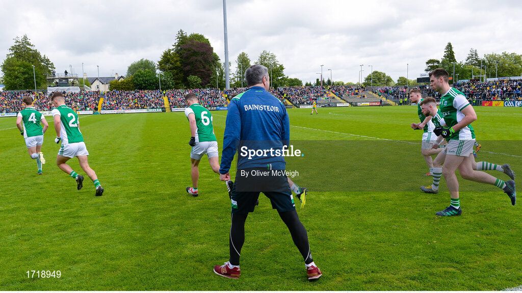 26 May 2019; Fermanagh Manager Rory Gallagher talking to his players after taking to the field again during the Ulster GAA Football Senior Championship Quarter-Final match between Fermanagh and Donegal at Brewster Park in Enniskillen, Fermanagh. Photo by Oliver McVeigh/Sportsfile
