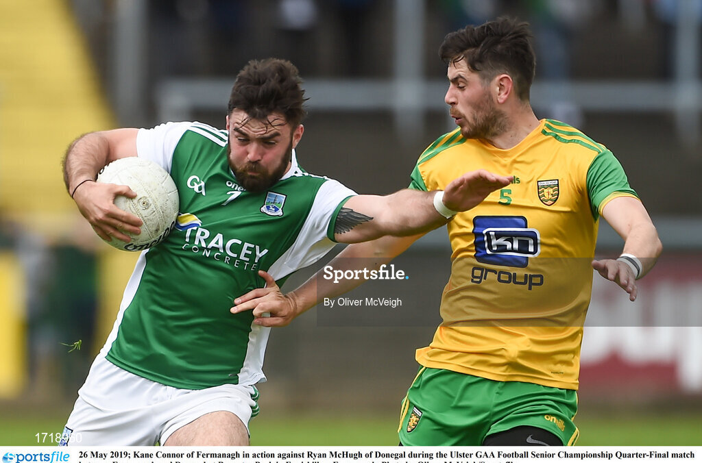 26 May 2019; Kane Connor of Fermanagh in action against Ryan McHugh of Donegal during the Ulster GAA Football Senior Championship Quarter-Final match between Fermanagh and Donegal at Brewster Park in Enniskillen, Fermanagh. Photo by Oliver McVeigh/Sportsfile