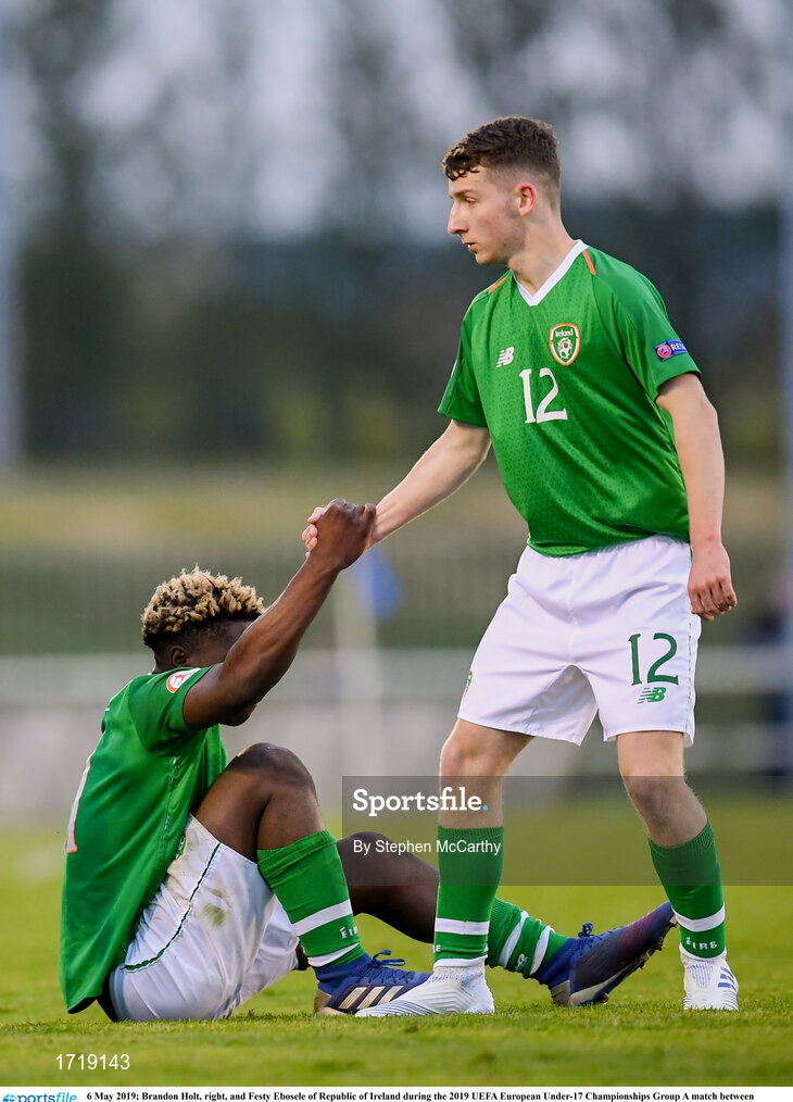 6 May 2019; Brandon Holt, right, and Festy Ebosele of Republic of Ireland during the 2019 UEFA European Under-17 Championships Group A match between Republic of Ireland and Czech Republic at the Regional Sports Centre in Waterford. Photo by Stephen McCarthy/Sportsfile