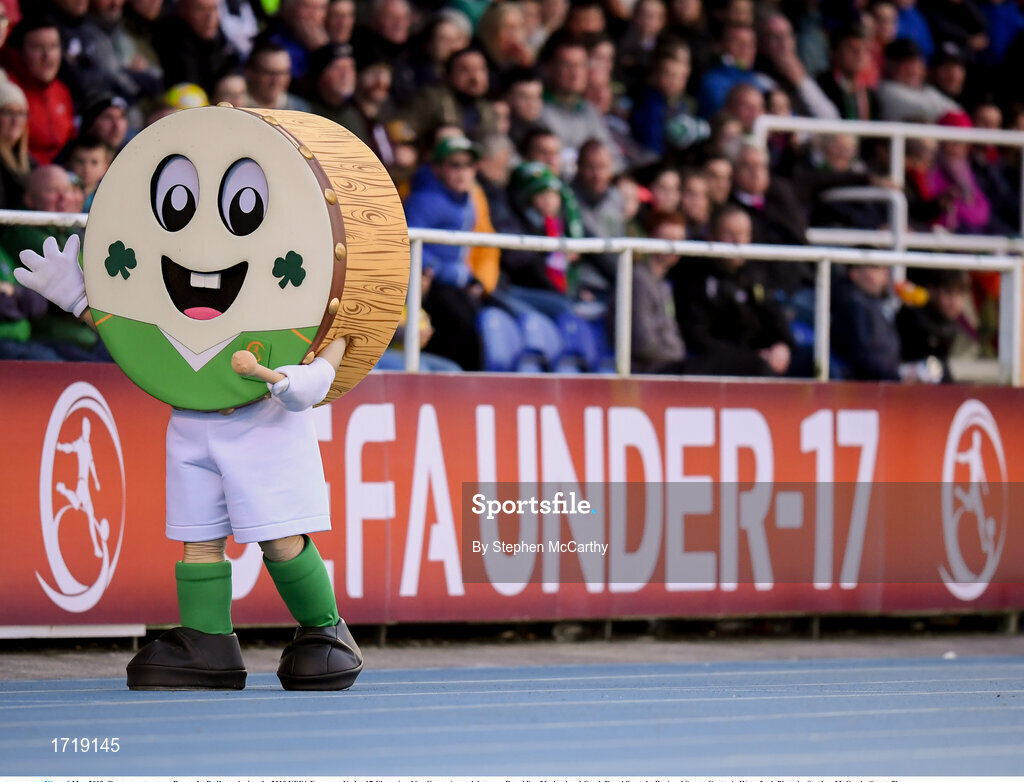 6 May 2019; Tournament mascot Barry the Bodhran during the 2019 UEFA European Under-17 Championships Group A match between Republic of Ireland and Czech Republic at the Regional Sports Centre in Waterford. Photo by Stephen McCarthy/Sportsfile
