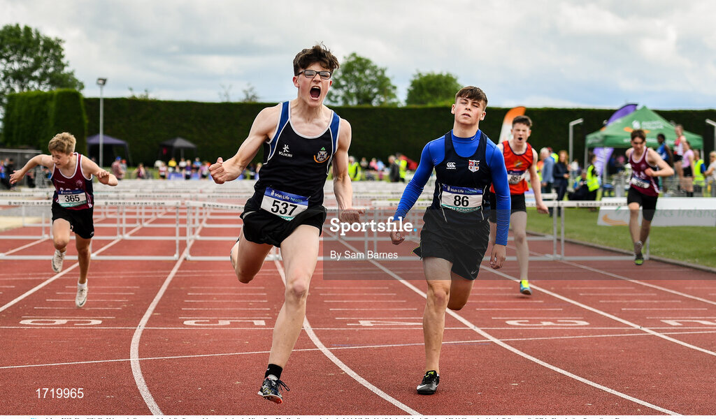 1 June 2019; Finn O'Neill of Limavady Grammar School, Co. Derry, celebrates winning the Minor Boys 75m Hurdles event during the Irish Life Health All-Ireland Schools Track and Field Championships in Tullamore, Co Offaly. Photo by Sam Barnes/Sportsfile
