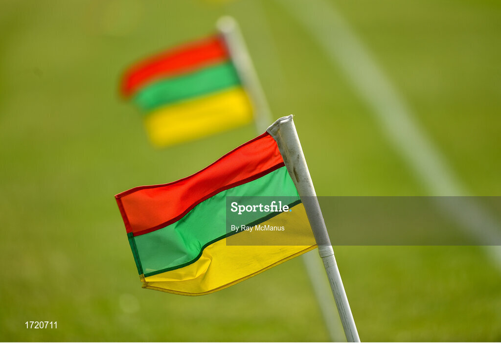2 June 2019; The Carlow County colours, on sideline flags, as they flutter in the wind before the Leinster GAA Hurling Senior Championship Round 3B match between Carlow and Dublin at Netwatch Cullen Park in Carlow. Photo by Ray McManus/Sportsfile