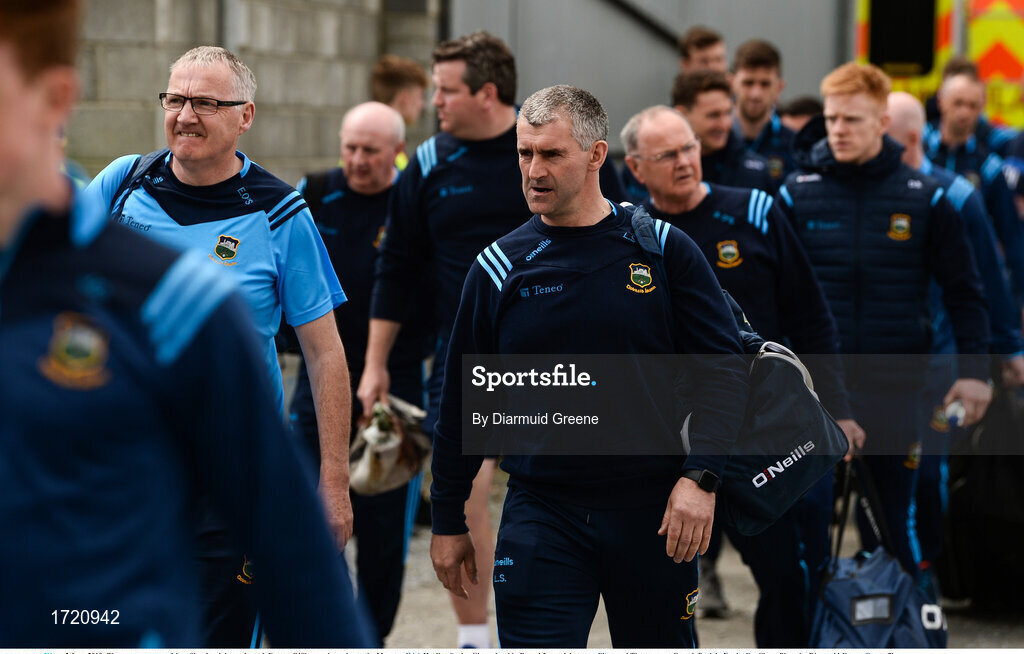 2 June 2019; Tipperary manager Liam Sheedy, right, and coach Eamon O'Shea arrive prior to the Munster GAA Hurling Senior Championship Round 3 match between Clare and Tipperary at Cusack Park in Ennis, Co. Clare. Photo by Diarmuid Greene/Sportsfile
