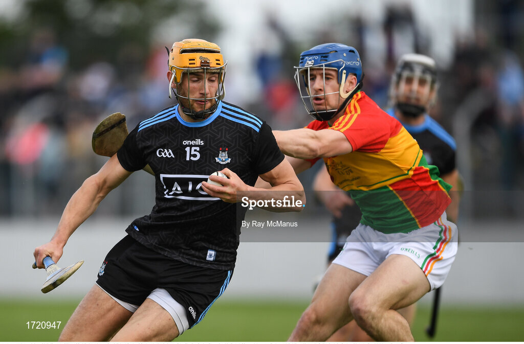 2 June 2019; Eamonn Dillon of Dublin in action against Michael Doyle of Carlow during Leinster GAA Hurling Senior Championship Round 3B match between Carlow and Dublin at Netwatch Cullen Park in Carlow. Photo by Ray McManus/Sportsfile