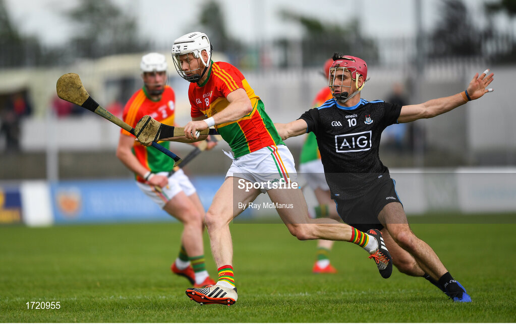 2 June 2019; Jack Kavanagh of Carlow in action against Danny Sutcliffe of Dublin during Leinster GAA Hurling Senior Championship Round 3B match between Carlow and Dublin at Netwatch Cullen Park in Carlow. Photo by Ray McManus/Sportsfile