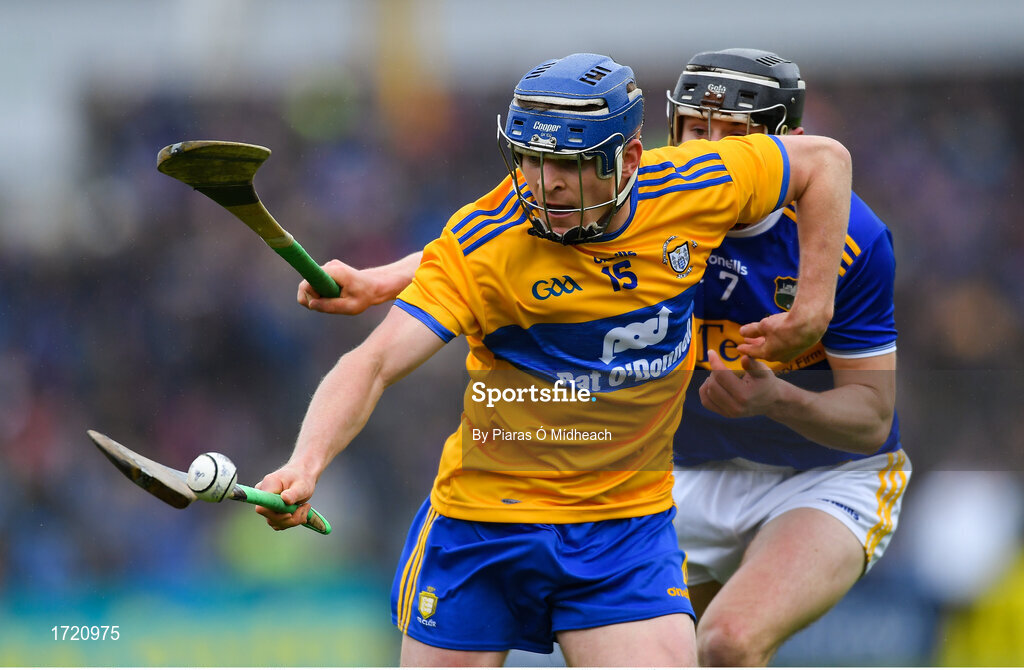 2 June 2019; Podge Collins of Clare in action against Alan Flynn of Tipperary during the Munster GAA Hurling Senior Championship Round 3 match between Clare and Tipperary at Cusack Park in Ennis, Co Clare. Photo by Piaras Ó Mídheach/Sportsfile