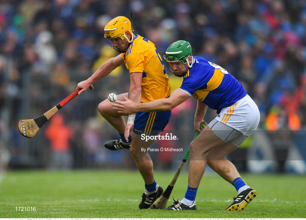 2 June 2019; Colm Galvin of Clare in action against Noel McGrath of Tipperary during the Munster GAA Hurling Senior Championship Round 3 match between Clare and Tipperary at Cusack Park in Ennis, Co Clare. Photo by Piaras Ó Mídheach/Sportsfile