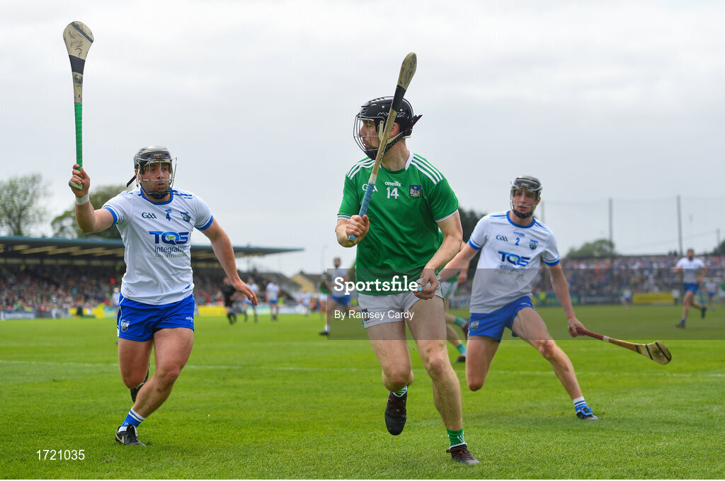2 June 2019; Graeme Mulcahy of Limerick in action against Noel Connors, left, and Calum Lyons of Waterford during the Munster GAA Hurling Senior Championship Round 3 match between Waterford and Limerick at Walsh Park in Waterford. Photo by Ramsey Cardy/Sportsfile