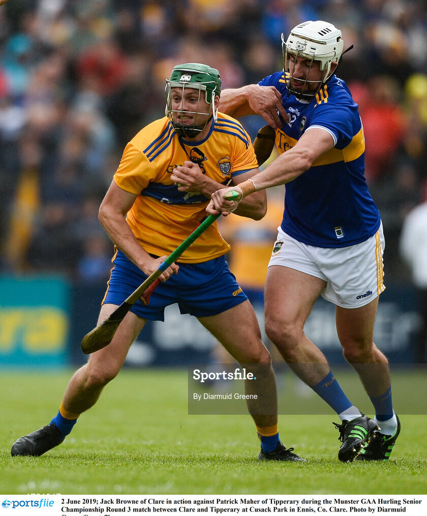 2 June 2019; Jack Browne of Clare in action against Patrick Maher of Tipperary during the Munster GAA Hurling Senior Championship Round 3 match between Clare and Tipperary at Cusack Park in Ennis, Co. Clare. Photo by Diarmuid Greene/Sportsfile