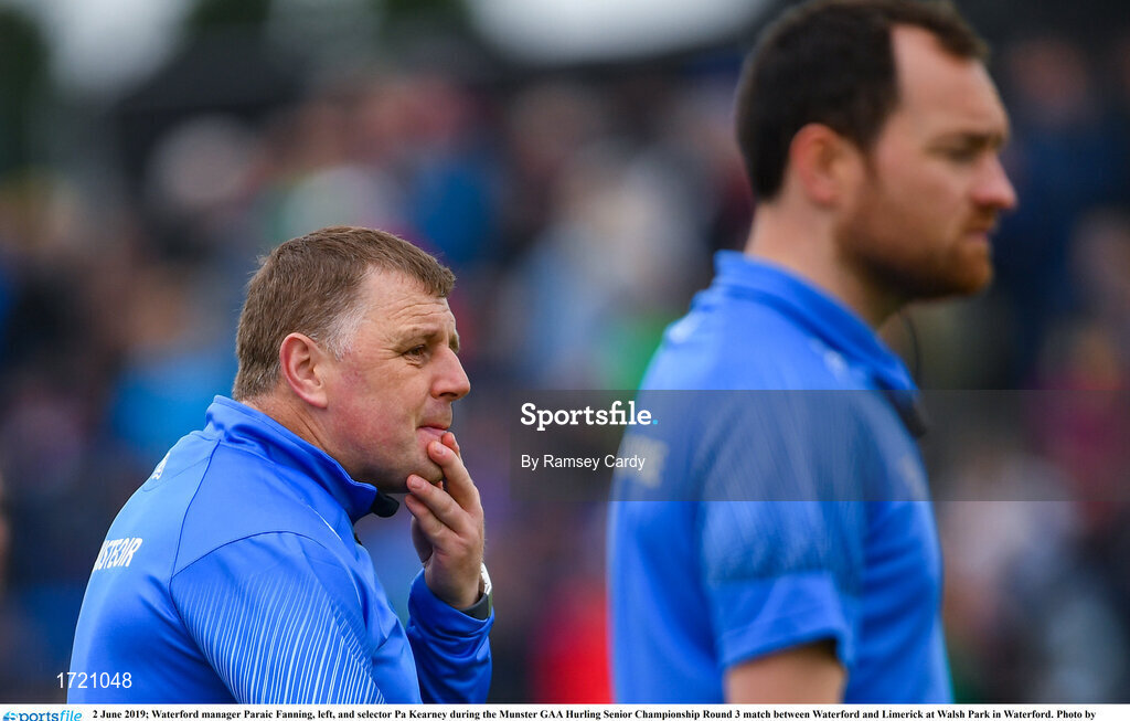 2 June 2019; Waterford manager Paraic Fanning, left, and selector Pa Kearney during the Munster GAA Hurling Senior Championship Round 3 match between Waterford and Limerick at Walsh Park in Waterford. Photo by Ramsey Cardy/Sportsfile
