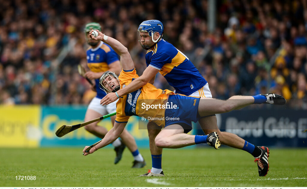 2 June 2019; Tony Kelly of Clare in action against John McGrath of Tipperary during the Munster GAA Hurling Senior Championship Round 3 match between Clare and Tipperary at Cusack Park in Ennis, Co. Clare. Photo by Diarmuid Greene/Sportsfile