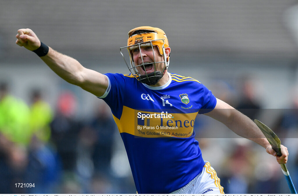 2 June 2019; Séamus Callanan of Tipperary celebrates scoring his side's second goal, which made him Tipperary's record all-time highest championship goal-scorer, during the Munster GAA Hurling Senior Championship Round 3 match between Clare and Tipperary at Cusack Park in Ennis, Co Clare. Photo by Piaras Ó Mídheach/Sportsfile