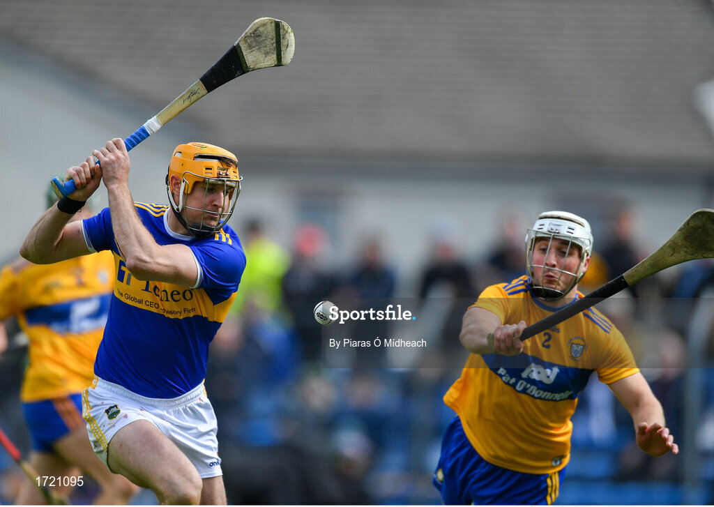 2 June 2019; Séamus Callanan of Tipperary shoots to score his side's second goal, despite the efforts of Patrick O'Connor of Clare, which made him Tipperary's record all-time highest championship goal-scorer, during the Munster GAA Hurling Senior Championship Round 3 match between Clare and Tipperary at Cusack Park in Ennis, Co Clare. Photo by Piaras Ó Mídheach/Sportsfile