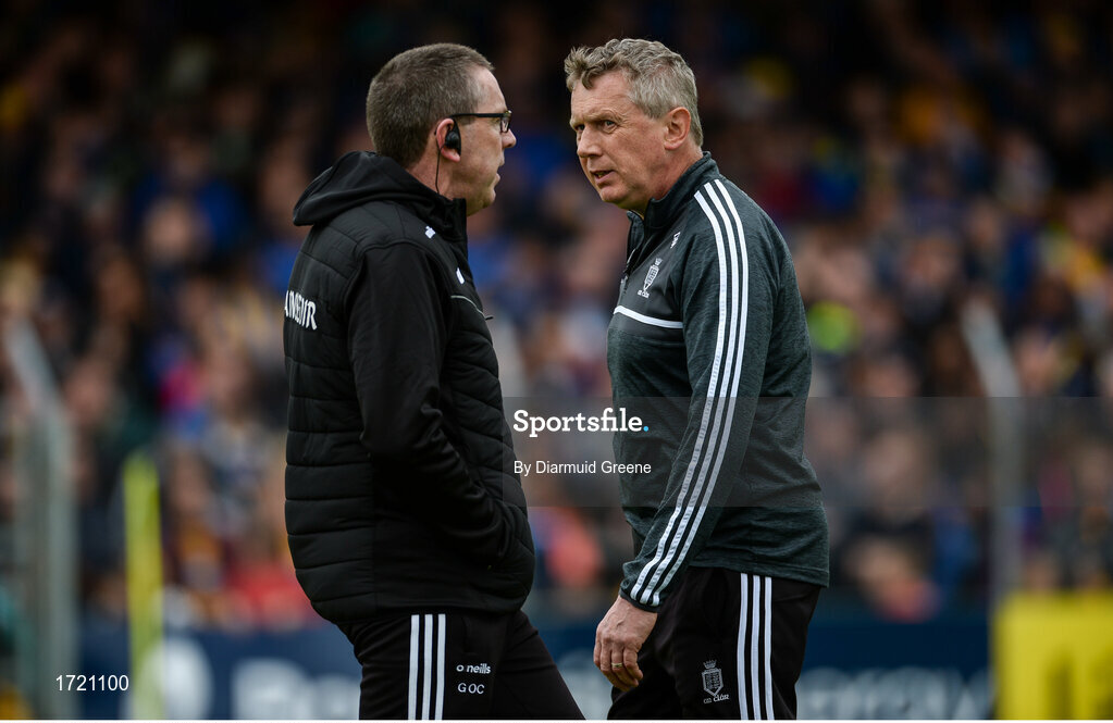 2 June 2019; Clare joint managers Gerry O'Connor, left, and Donal Moloney prior to the Munster GAA Hurling Senior Championship Round 3 match between Clare and Tipperary at Cusack Park in Ennis, Co. Clare. Photo by Diarmuid Greene/Sportsfile