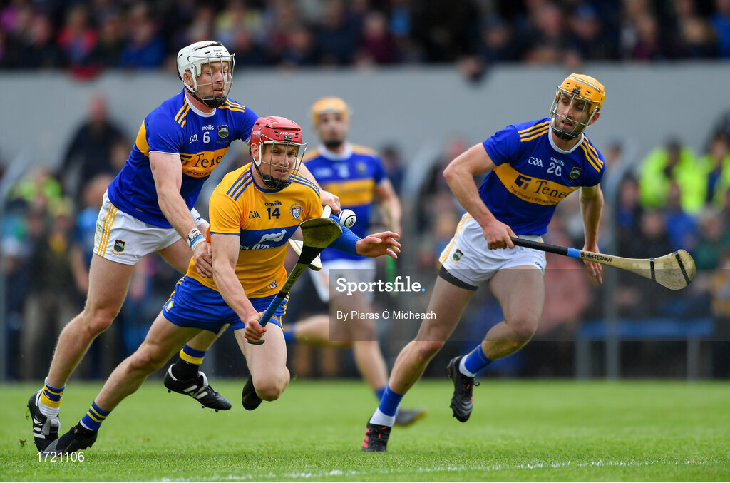 2 June 2019; John Conlon of Clare is fouled by Pádraic Maher of Tipperary, left, as team-mate Barry Heffernan looks on during the Munster GAA Hurling Senior Championship Round 3 match between Clare and Tipperary at Cusack Park in Ennis, Co Clare. Photo by Piaras Ó Mídheach/Sportsfile