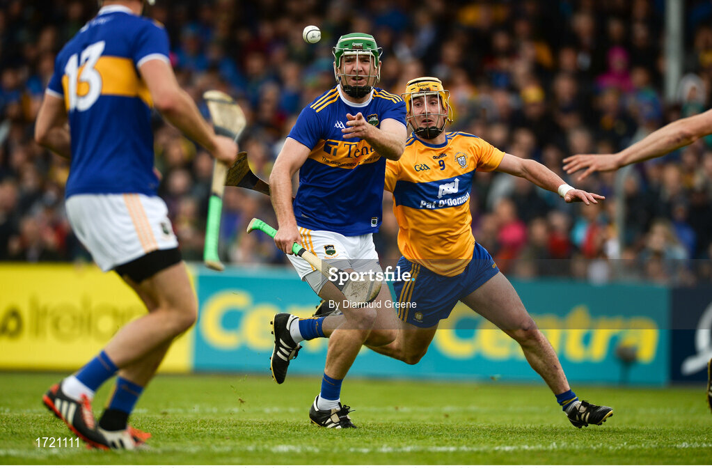 2 June 2019; Noel McGrath of Tipperary in action against Colm Galvin of Clare during the Munster GAA Hurling Senior Championship Round 3 match between Clare and Tipperary at Cusack Park in Ennis, Co.Clare. Photo by Diarmuid Greene/Sportsfile