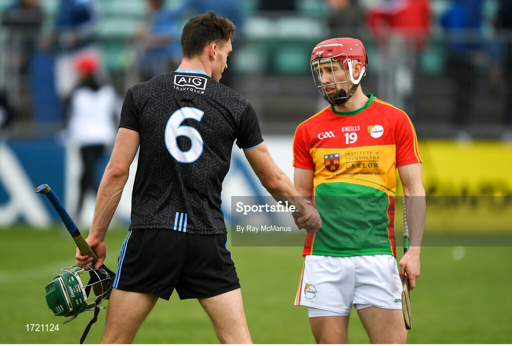 2 June 2019; Chris Crummey of Dublin and Denis Murphy of Carlow shake hands after the Leinster GAA Hurling Senior Championship Round 3B match between Carlow and Dublin at Netwatch Cullen Park in Carlow. Photo by Ray McManus/Sportsfile