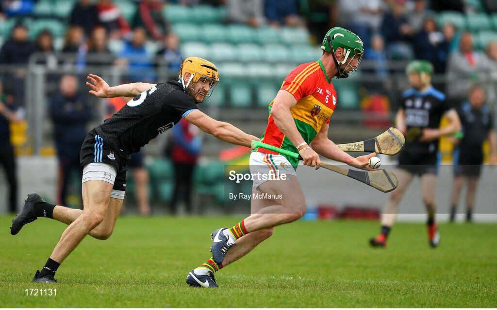 2 June 2019; David English of Carlow is tackled by Eamonn Dillon of Dublin during the Leinster GAA Hurling Senior Championship Round 3B match between Carlow and Dublin at Netwatch Cullen Park in Carlow. Photo by Ray McManus/Sportsfile