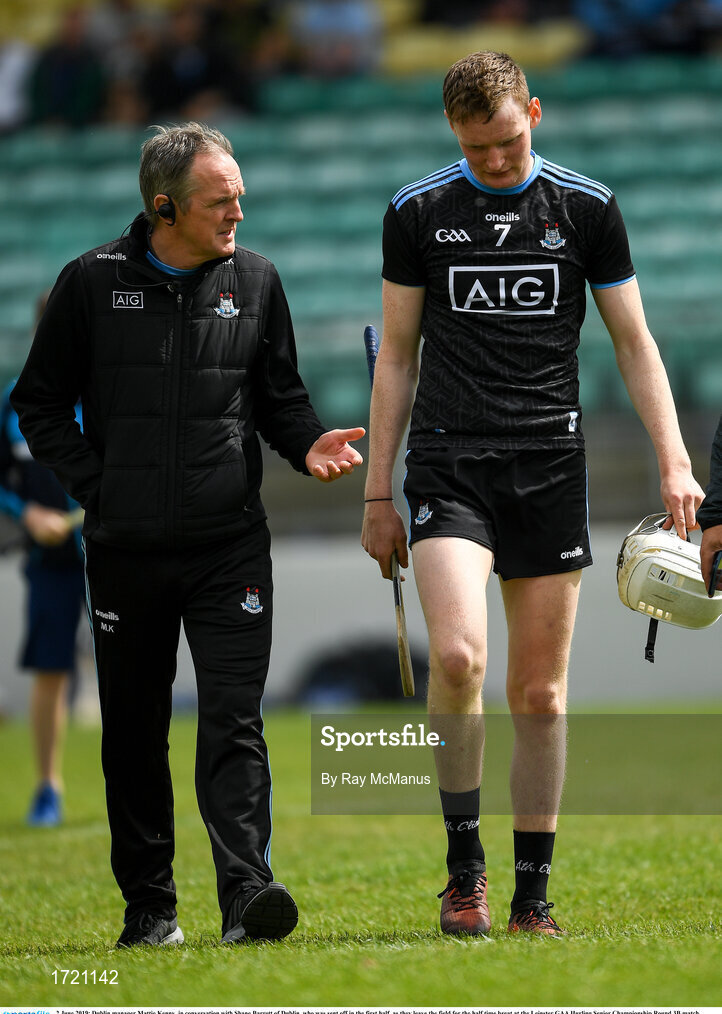 2 June 2019; Dublin manager Mattie Kenny in conversation with Shane Barrett of Dublin, who was sent off in the first half, as they leave the field for the half time breat at the Leinster GAA Hurling Senior Championship Round 3B match between Carlow and Dublin at Netwatch Cullen Park in Carlow. Photo by Ray McManus/Sportsfile