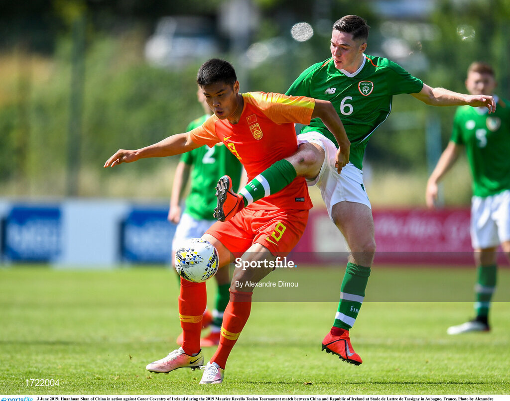 3 June 2019; Huanhuan Shan of China in action against Conor Coventry of Ireland during the 2019 Maurice Revello Toulon Tournament match between China and Republic of Ireland at Stade de Lattre de Tassigny in Aubagne, France. Photo by Alexandre Dimou/Sportsfile
