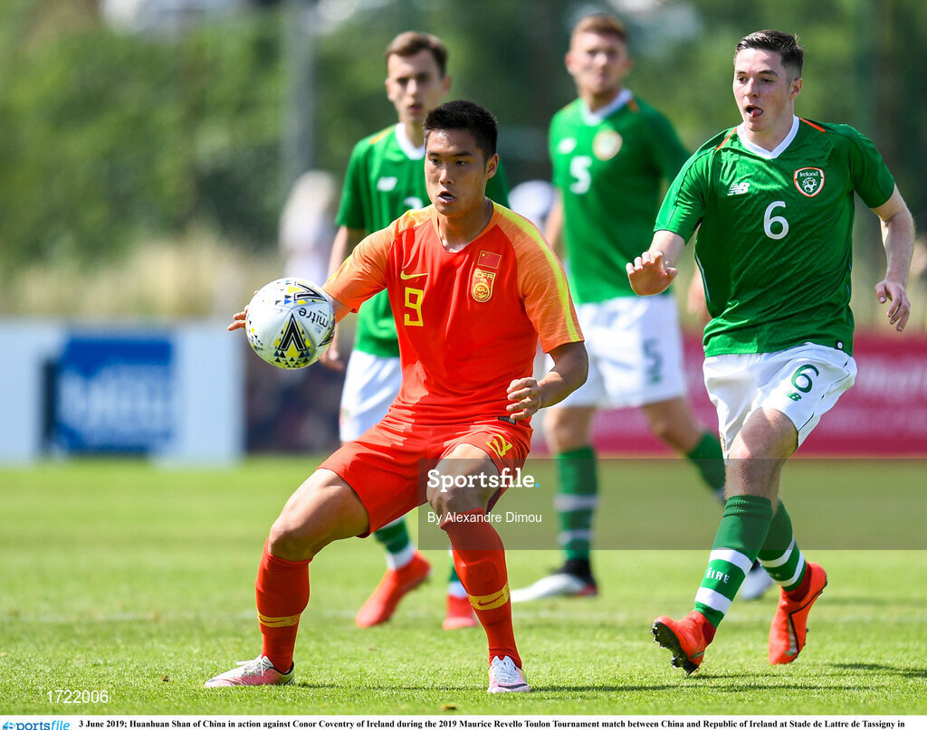 3 June 2019; Huanhuan Shan of China in action against Conor Coventry of Ireland during the 2019 Maurice Revello Toulon Tournament match between China and Republic of Ireland at Stade de Lattre de Tassigny in Aubagne, France. Photo by Alexandre Dimou/Sportsfile
