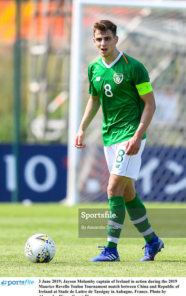 3 June 2019; Jayson Molumby captain of Ireland in action during the 2019 Maurice Revello Toulon Tournament match between China and Republic of Ireland at Stade de Lattre de Tassigny in Aubagne, France. Photo by Alexandre Dimou/Sportsfile