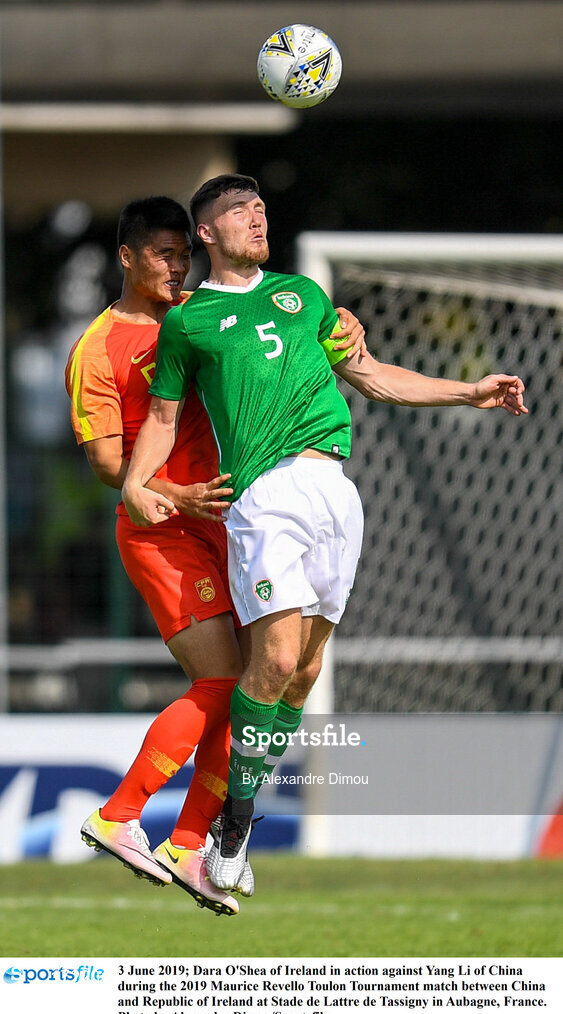 3 June 2019; Dara O'Shea of Ireland in action against Yang Li of China during the 2019 Maurice Revello Toulon Tournament match between China and Republic of Ireland at Stade de Lattre de Tassigny in Aubagne, France. Photo by Alexandre Dimou/Sportsfile