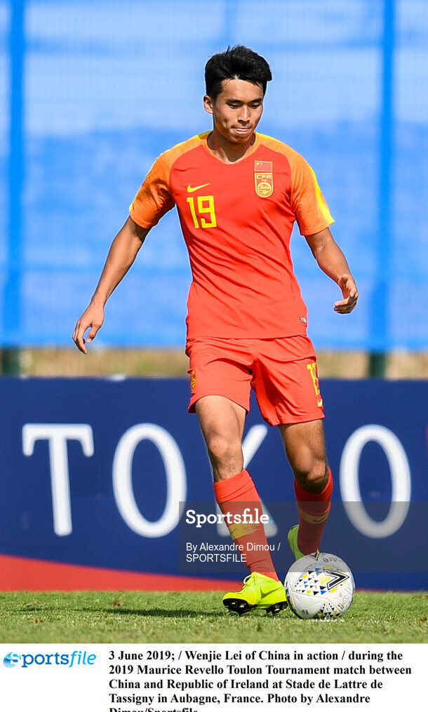 3 June 2019; / Wenjie Lei of China in action / during the 2019 Maurice Revello Toulon Tournament match between China and Republic of Ireland at Stade de Lattre de Tassigny in Aubagne, France. Photo by Alexandre Dimou/Sportsfile