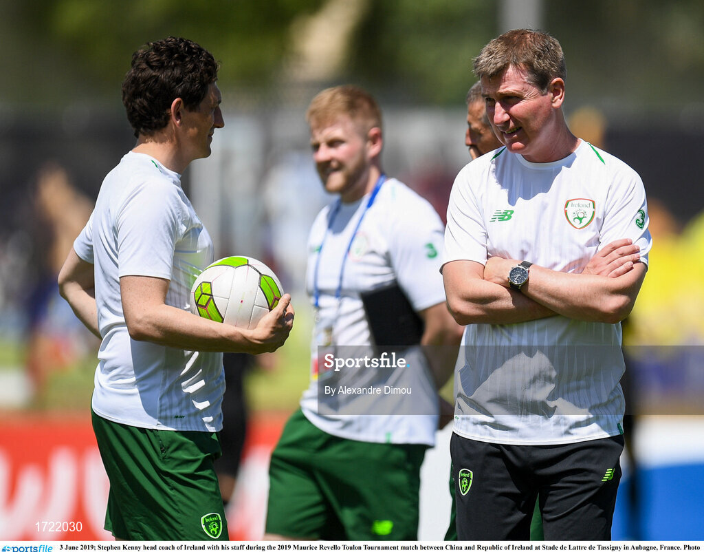3 June 2019; Stephen Kenny head coach of Ireland with his staff during the 2019 Maurice Revello Toulon Tournament match between China and Republic of Ireland at Stade de Lattre de Tassigny in Aubagne, France. Photo by Alexandre Dimou/Sportsfile