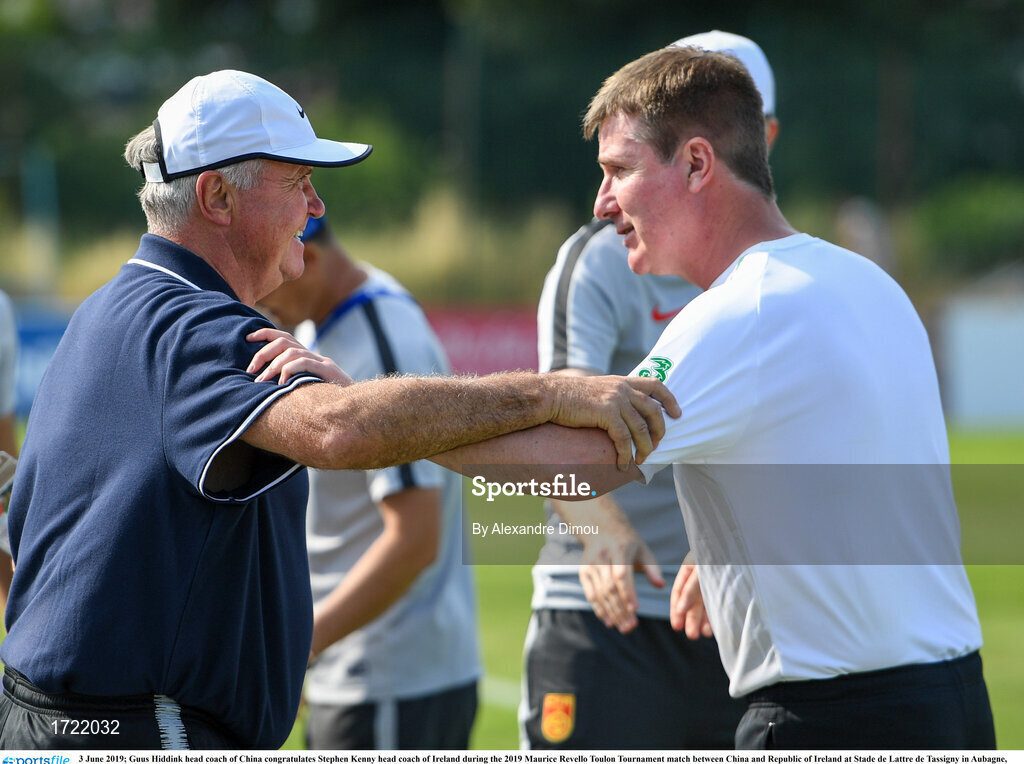 3 June 2019; Guus Hiddink head coach of China congratulates Stephen Kenny head coach of Ireland during the 2019 Maurice Revello Toulon Tournament match between China and Republic of Ireland at Stade de Lattre de Tassigny in Aubagne, France. Photo by Alexandre Dimou/Sportsfile