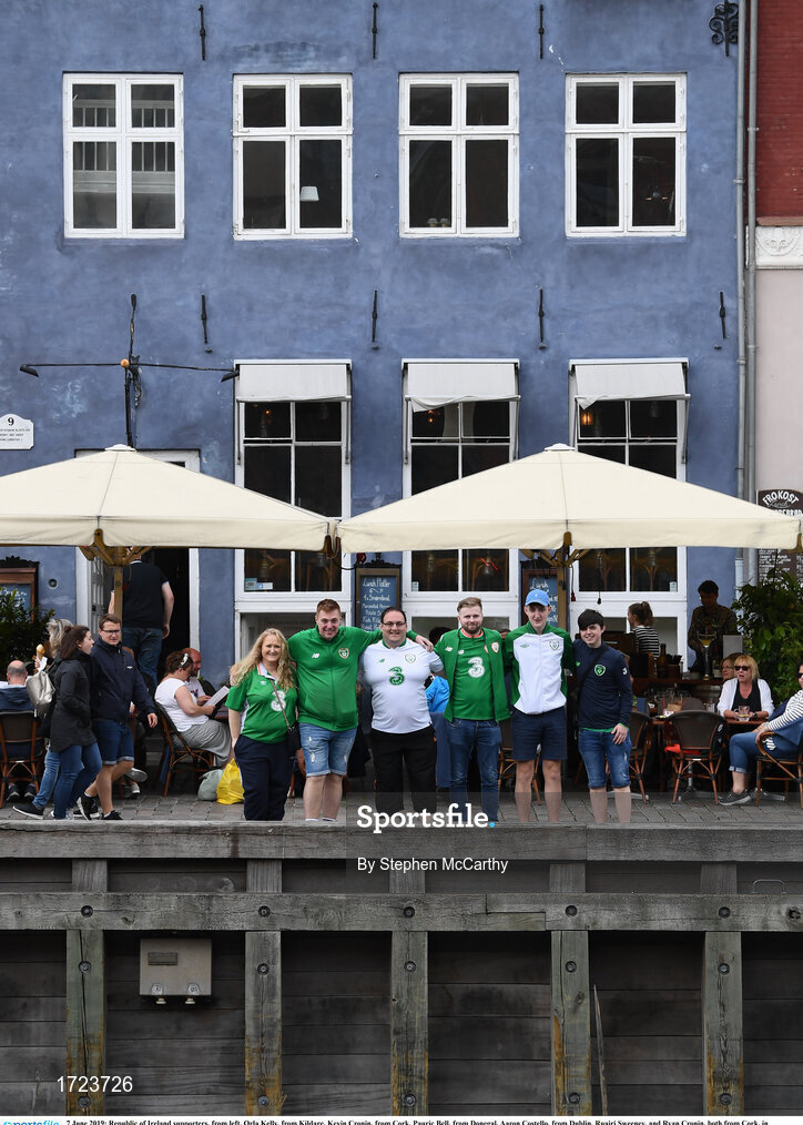 7 June 2019; Republic of Ireland supporters, from left, Orla Kelly, from Kildare, Kevin Cronin, from Cork, Pauric Bell, from Donegal, Aaron Costello, from Dublin, Ruairi Sweeney, and Ryan Cronin, both from Cork, in Copenhagen prior to the UEFA EURO2020 Qualifier Group D match between Denmark and Republic of Ireland at Telia Parken in Copenhagen, Denmark. Photo by Stephen McCarthy/Sportsfile
