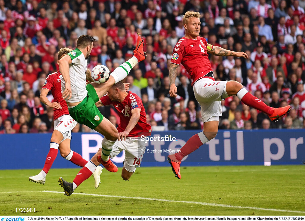 7 June 2019; Shane Duffy of Republic of Ireland has a shot on goal despite the attention of Denmark players, from left, Jens Stryger Larsen, Henrik Dalsgaard and Simon Kjær during the UEFA EURO2020 Qualifier Group D match between Denmark and Republic of Ireland at Telia Parken in Copenhagen, Denmark. Photo by Stephen McCarthy/Sportsfile