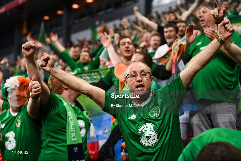 7 June 2019; Republic of Ireland supporters celebrate following the UEFA EURO2020 Qualifier Group D match between Denmark and Republic of Ireland at Telia Parken in Copenhagen, Denmark. Photo by Stephen McCarthy/Sportsfile