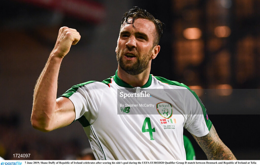 7 June 2019; Shane Duffy of Republic of Ireland celebrates after scoring his side's goal during the UEFA EURO2020 Qualifier Group D match between Denmark and Republic of Ireland at Telia Parken in Copenhagen, Denmark. Photo by Stephen McCarthy/Sportsfile