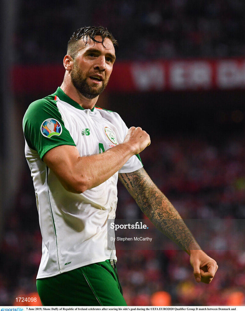 7 June 2019; Shane Duffy of Republic of Ireland celebrates after scoring his side's goal during the UEFA EURO2020 Qualifier Group D match between Denmark and Republic of Ireland at Telia Parken in Copenhagen, Denmark. Photo by Stephen McCarthy/Sportsfile