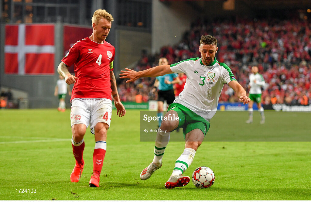 7 June 2019; Enda Stevens of Republic of Ireland and Simon Kjær of Denmark during the UEFA EURO2020 Qualifier Group D match between Denmark and Republic of Ireland at Telia Parken in Copenhagen, Denmark. Photo by Seb Daly/Sportsfile