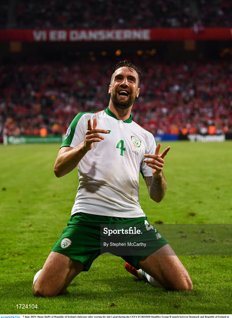 7 June 2019; Shane Duffy of Republic of Ireland celebrates after scoring his side's goal during the UEFA EURO2020 Qualifier Group D match between Denmark and Republic of Ireland at Telia Parken in Copenhagen, Denmark. Photo by Stephen McCarthy/Sportsfile