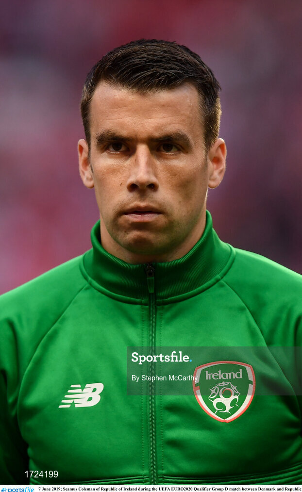 7 June 2019; Seamus Coleman of Republic of Ireland during the UEFA EURO2020 Qualifier Group D match between Denmark and Republic of Ireland at Telia Parken in Copenhagen, Denmark. Photo by Stephen McCarthy/Sportsfile