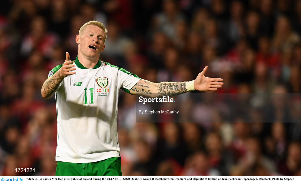 7 June 2019; James McClean of Republic of Ireland during the UEFA EURO2020 Qualifier Group D match between Denmark and Republic of Ireland at Telia Parken in Copenhagen, Denmark. Photo by Stephen McCarthy/Sportsfile