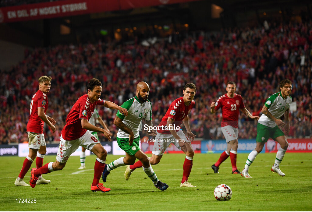 7 June 2019; David McGoldrick of Republic of Ireland and Thomas Delaney of Denmark during the UEFA EURO2020 Qualifier Group D match between Denmark and Republic of Ireland at Telia Parken in Copenhagen, Denmark. Photo by Stephen McCarthy/Sportsfile