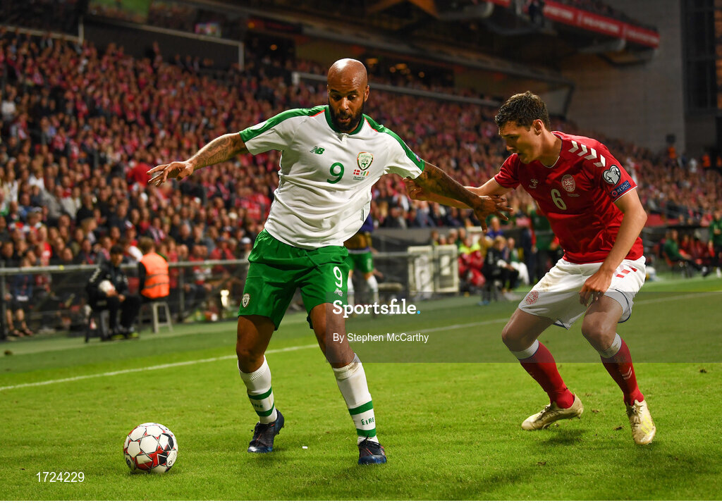 7 June 2019; David McGoldrick of Republic of Ireland and Andreas Christensen of Denmark during the UEFA EURO2020 Qualifier Group D match between Denmark and Republic of Ireland at Telia Parken in Copenhagen, Denmark. Photo by Stephen McCarthy/Sportsfile
