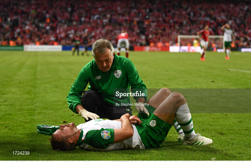 7 June 2019; Alan Judge of Republic of Ireland is attended to by Dr Alan Byrne, Republic of Ireland team doctor, during the UEFA EURO2020 Qualifier Group D match between Denmark and Republic of Ireland at Telia Parken in Copenhagen, Denmark. Photo by Stephen McCarthy/Sportsfile