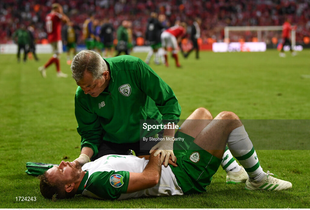 7 June 2019; Alan Judge of Republic of Ireland is attended to by Dr Alan Byrne, Republic of Ireland team doctor, during the UEFA EURO2020 Qualifier Group D match between Denmark and Republic of Ireland at Telia Parken in Copenhagen, Denmark. Photo by Stephen McCarthy/Sportsfile