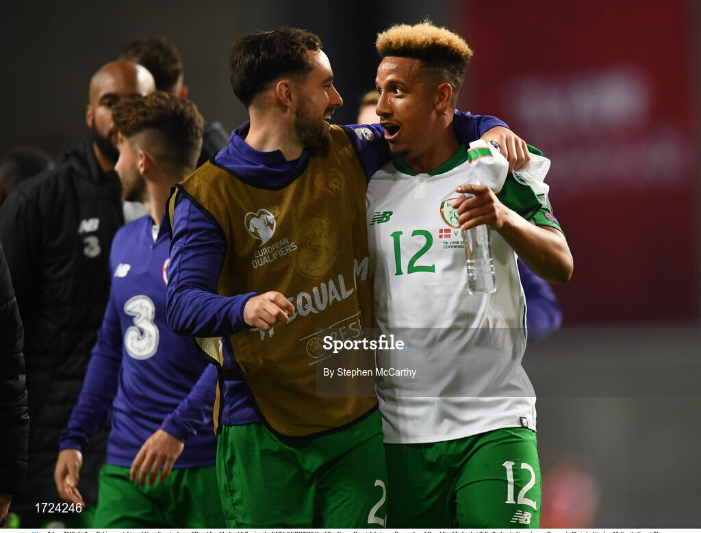 7 June 2019; Callum Robinson, right, and Greg Cunningham of Republic of Ireland following the UEFA EURO2020 Qualifier Group D match between Denmark and Republic of Ireland at Telia Parken in Copenhagen, Denmark. Photo by Stephen McCarthy/Sportsfile