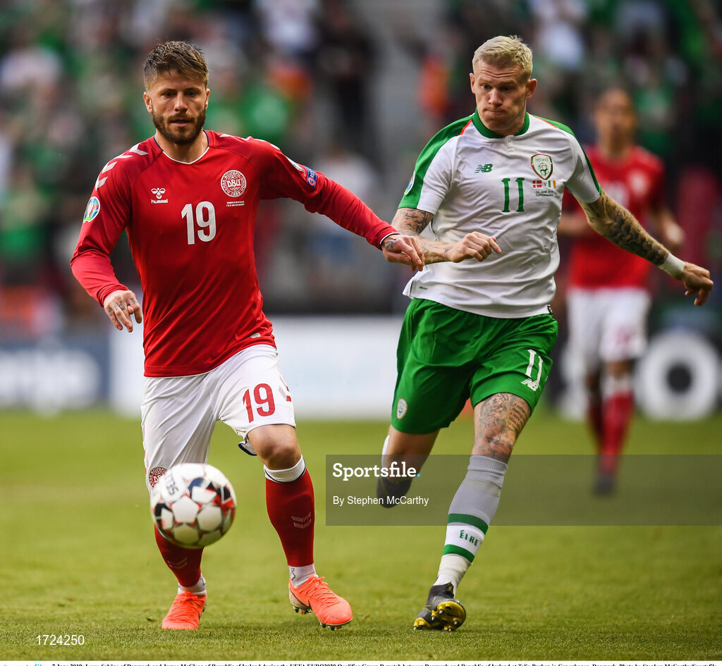 7 June 2019; Lasse Schöne of Denmark and James McClean of Republic of Ireland during the UEFA EURO2020 Qualifier Group D match between Denmark and Republic of Ireland at Telia Parken in Copenhagen, Denmark. Photo by Stephen McCarthy/Sportsfile