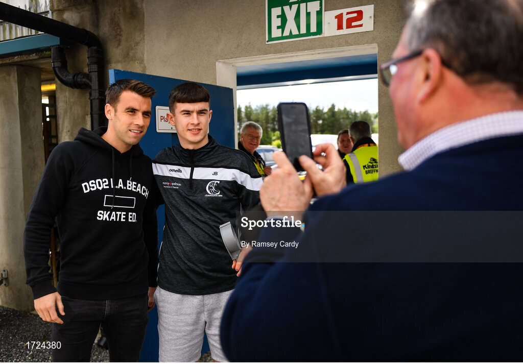 8 June 2019; Republic of Ireland captain Seamus Coleman has his photograph taken with a supporter ahead of the Ulster GAA Football Senior Championship semi-final match between Donegal and Tyrone at Kingspan Breffni Park in Cavan. Photo by Ramsey Cardy/Sportsfile