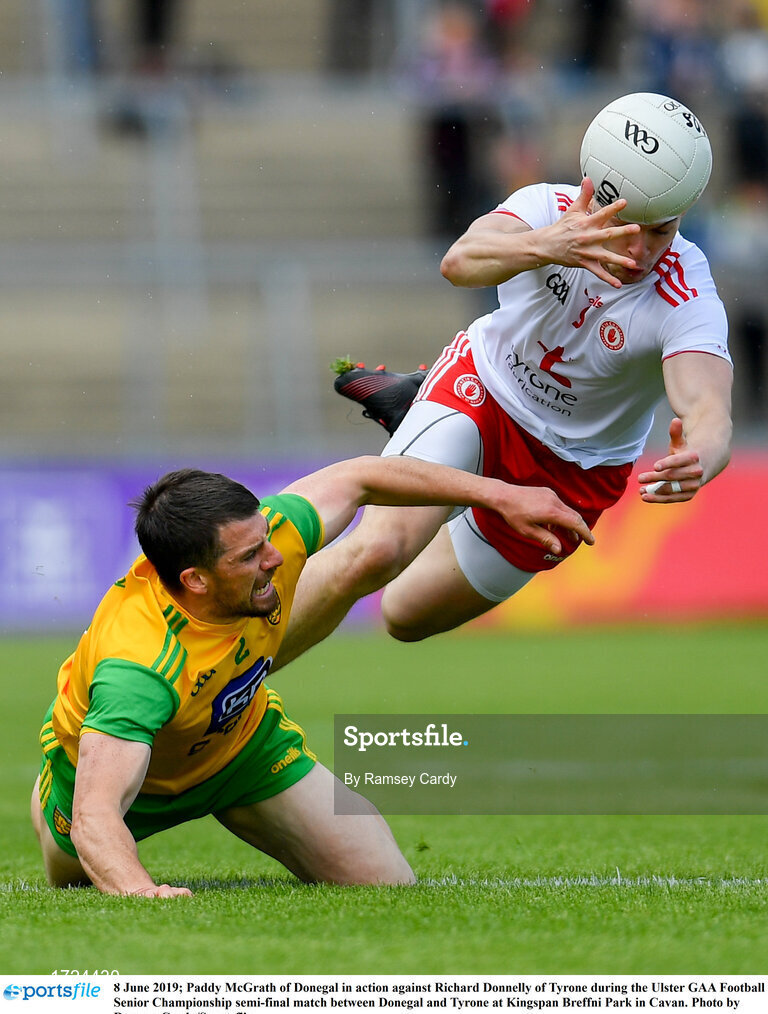 8 June 2019; Paddy McGrath of Donegal in action against Richard Donnelly of Tyrone during the Ulster GAA Football Senior Championship semi-final match between Donegal and Tyrone at Kingspan Breffni Park in Cavan. Photo by Ramsey Cardy/Sportsfile