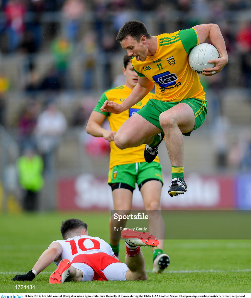 8 June 2019; Leo McLoone of Donegal in action against Matthew Donnelly of Tyrone during the Ulster GAA Football Senior Championship semi-final match between Donegal and Tyrone at Kingspan Breffni Park in Cavan. Photo by Ramsey Cardy/Sportsfile