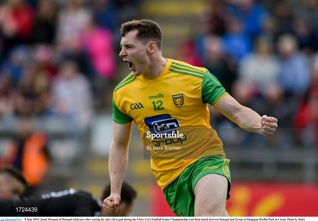 8 June 2019; Jamie Brennan of Donegal celebrates after scoring his side's first goal during the Ulster GAA Football Senior Championship semi-final match between Donegal and Tyrone at Kingspan Breffni Park in Cavan. Photo by Daire Brennan/Sportsfile