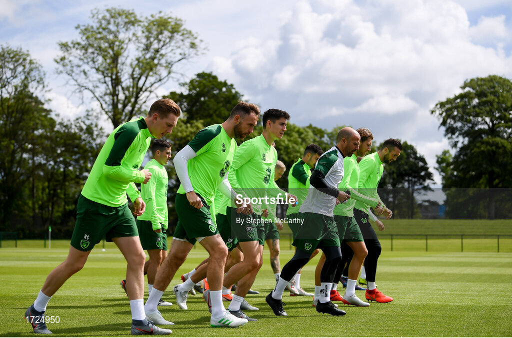 9 June 2019; Republic of Ireland players, from left, Ronan Curtis, Richard Keogh, Callum O'Dowda, fitness coach Andy Liddle, Jeff Hendrick and Shane Duffy during a Republic of Ireland training session at the FAI National Training Centre in Abbotstown, Dublin. Photo by Stephen McCarthy/Sportsfile